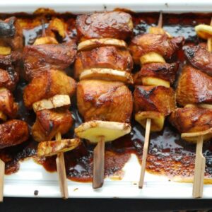 - Placer les dés de poulet sur une brochette et faire cuire sur au barbecue ou au four 7 à 10 min en les retournant régulièrement