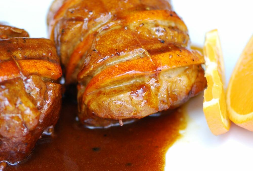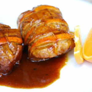 - Couper à vif de petits quartiers d’orange avec la pelure, introduire ces quartiers dans les fentes, pelures au-dessus (à la manière du veau Orloff) Ficelez convenablement chaque tronçon afin de faire un petit filet, salez, poivrez