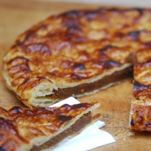 - Sur une des pâtes feuilletées, verser la frangipane en laissant 2 cm de bord. Y déposer la fève.